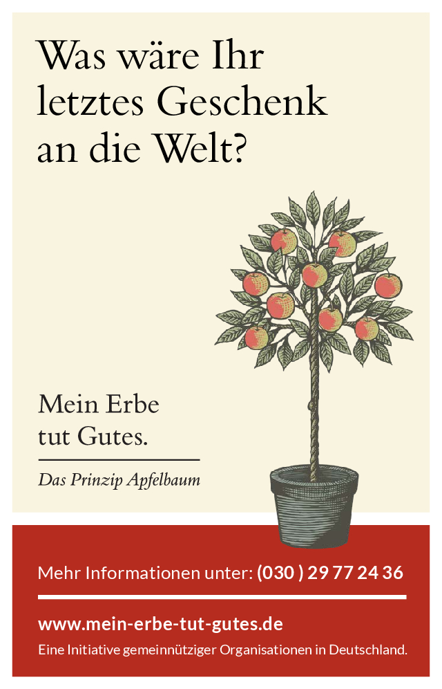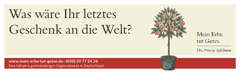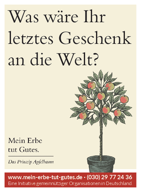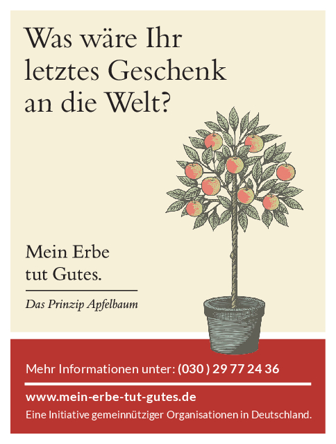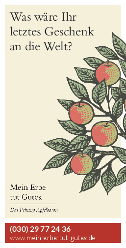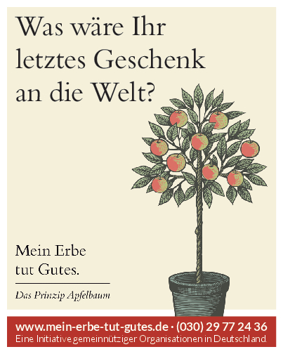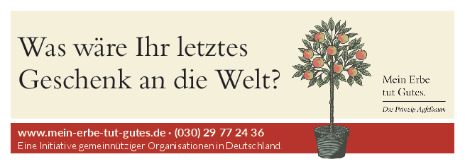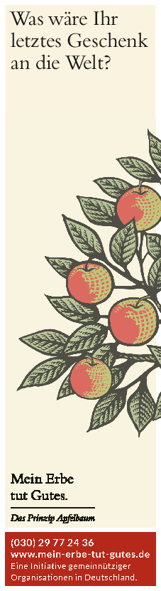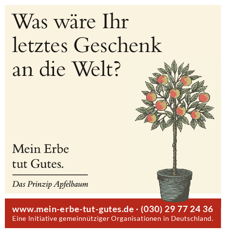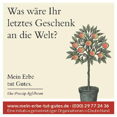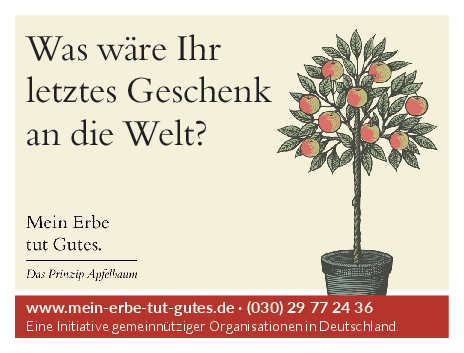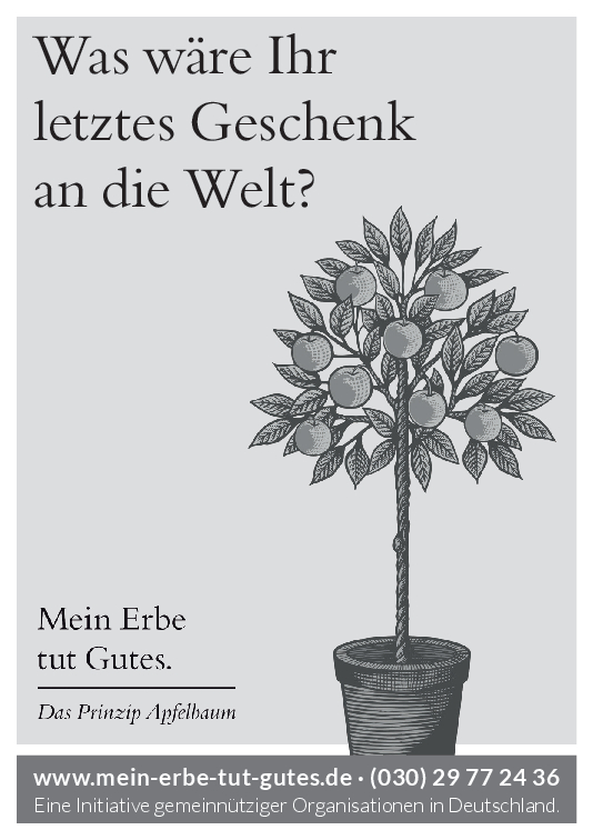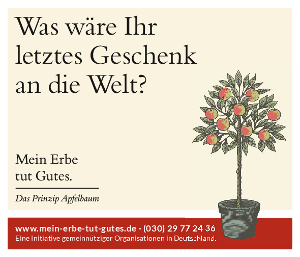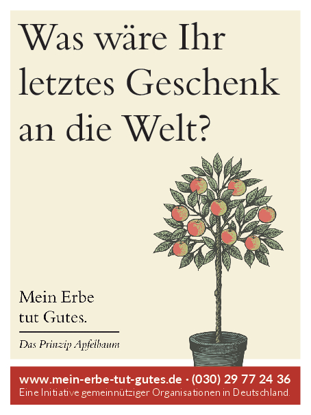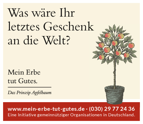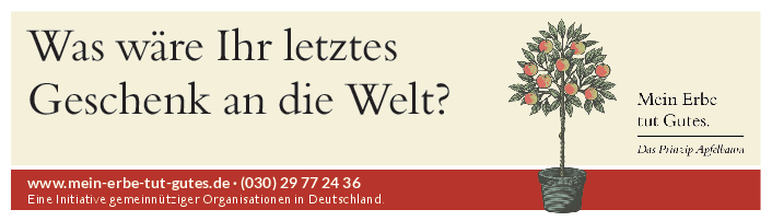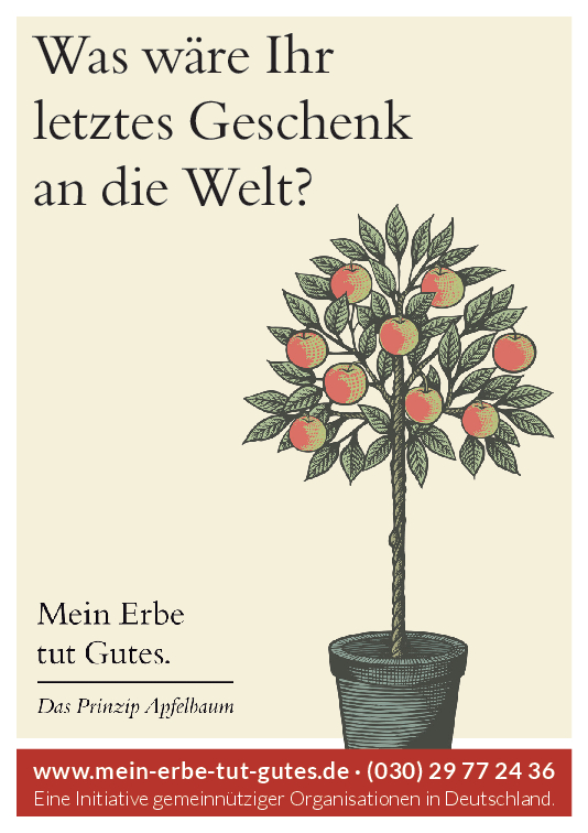 „Mein Erbe tut Gutes. Das Prinzip Apfelbaum“ ist ein Zusammenschluss 26 namhafter gemeinnütziger Organisationen und Stiftungen. Ziel der Initiative ist es, das Erbe für den guten Zweck ins öffentliche Bewusstsein zu rücken und Interessierte darüber zu informieren. Zudem beantwortet die Initiative grundlegende Fragen zum Erben und Vererben und möchte potenziellen Erblassern oder angehenden Erben so Sicherheit geben.