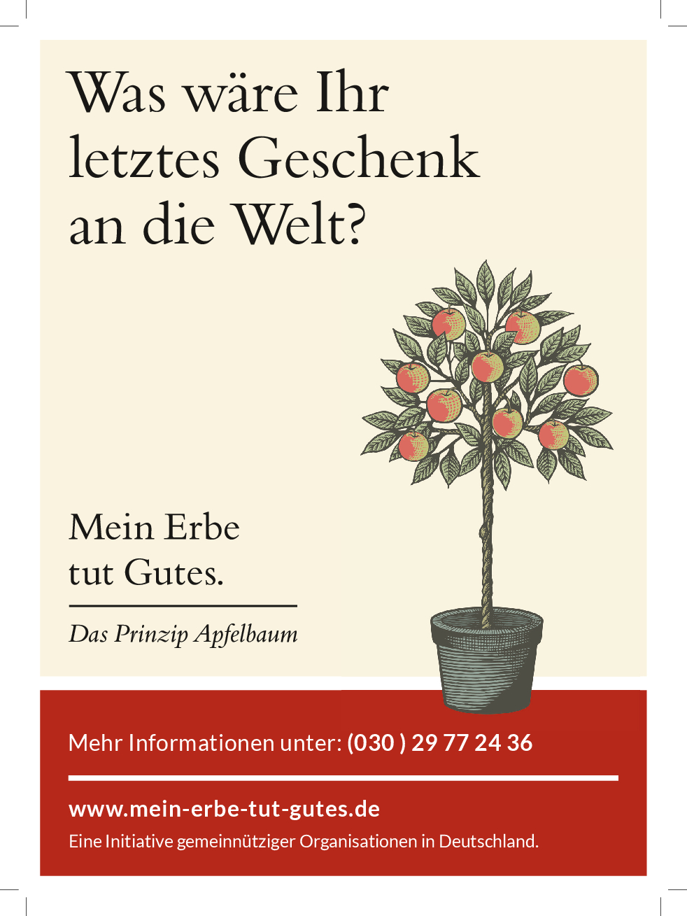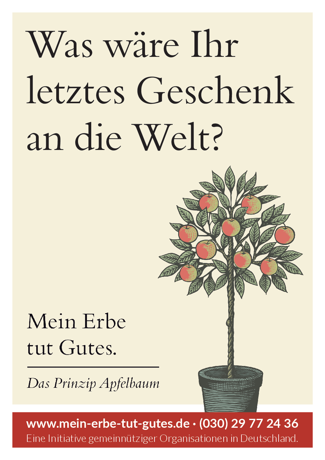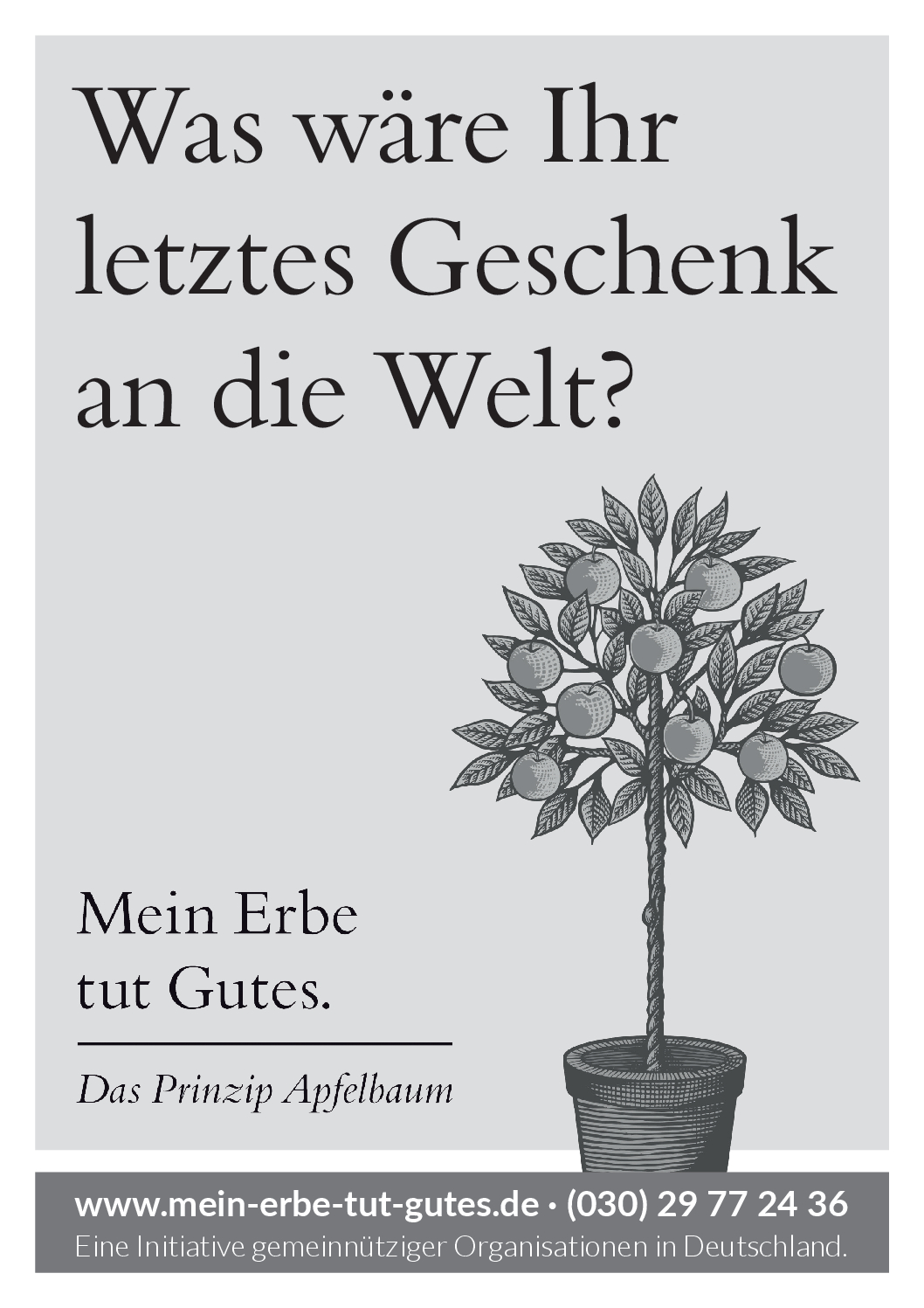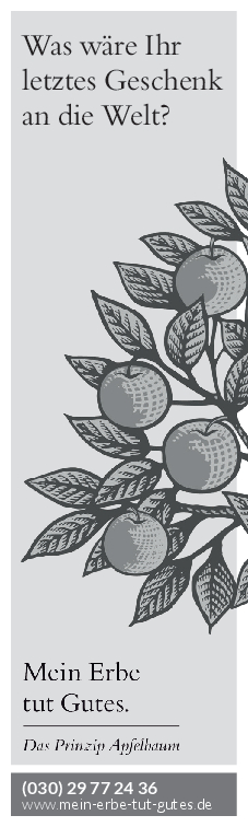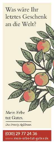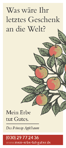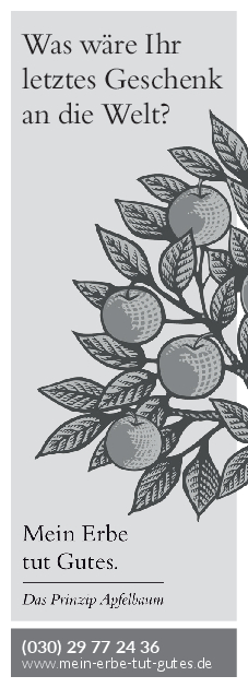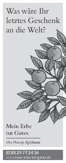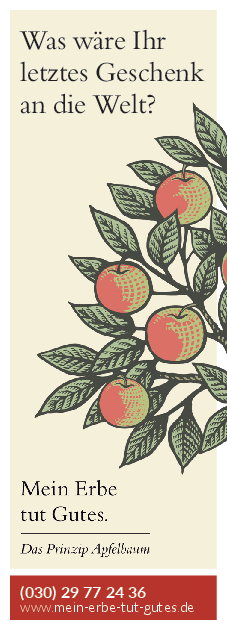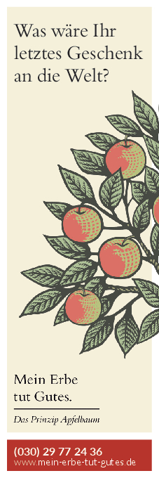 „Mein Erbe tut Gutes. Das Prinzip Apfelbaum“ ist ein Zusammenschluss 26 namhafter gemeinnütziger Organisationen und Stiftungen. Ziel der Initiative ist es, das Erbe für den guten Zweck ins öffentliche Bewusstsein zu rücken und Interessierte darüber zu informieren. Zudem beantwortet die Initiative grundlegende Fragen zum Erben und Vererben und möchte potenziellen Erblassern oder angehenden Erben so Sicherheit geben.