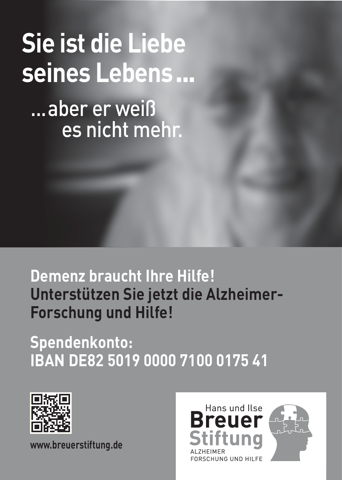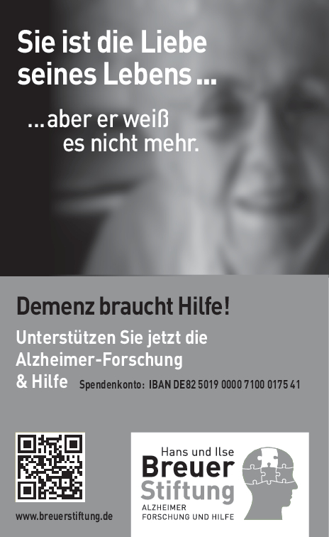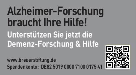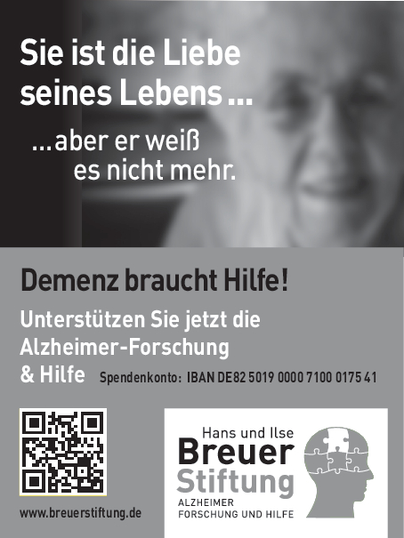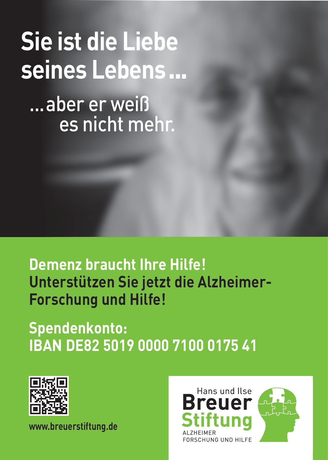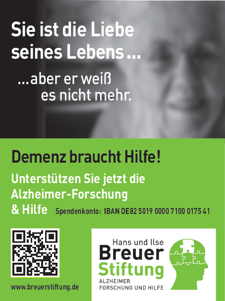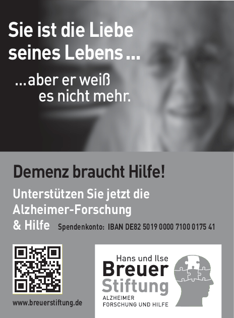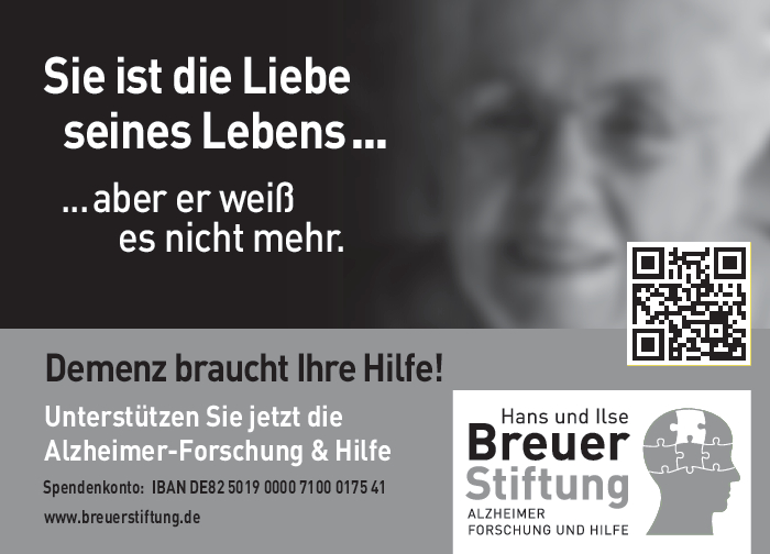Alle 90 Sekunden lebt in Deutschland ein Mensch mehr mit der Diagnose Demenz. Demenz betrifft nicht nur die Betroffenen, sondern auch ihre Familien. Oft empfinden die Betroffenen und ihre Angehörigen nach der Diagnose Scham und ziehen sich zurück – eine Isolation, die die Krankheit verschlimmern kann. Die Hans und Ilse Breuer-Stiftung setzt sich dafür ein, diesen Kreislauf zu durchbrechen. Mit Aufklärung und gezielter Unterstützung wollen wir Betroffenen und Angehörigen zeigen, dass sie nicht allein sind. Unsere Hilfsangebote reichen von Beratungen über Schulung bis hin zu praktischer Unterstützung im Alltag. Jeder soll wissen, an wen er sich wenden kann, wenn die Diagnose das Leben verändert. Gemeinsam können wir das Stigma um Demenz abbauen und Betroffenen wieder ein Stück Lebensqualität schenken. Lassen Sie uns die Isolation durchbrechen – gemeinsam stark gegen Demenz.