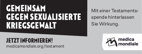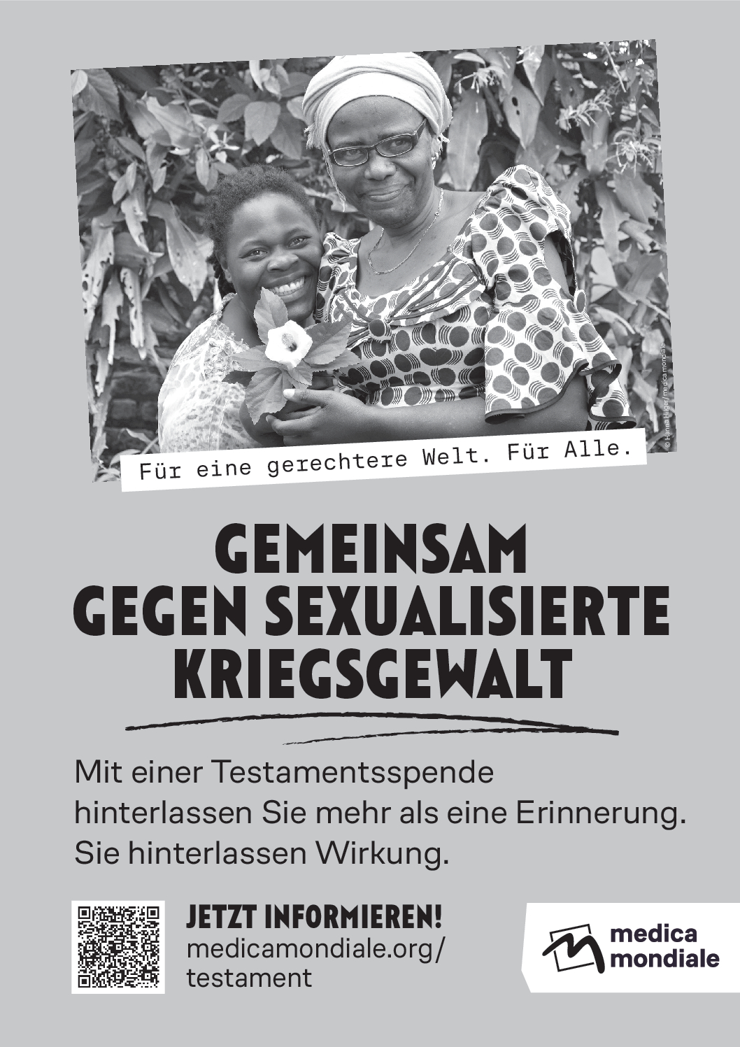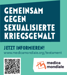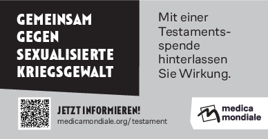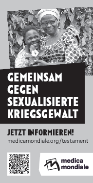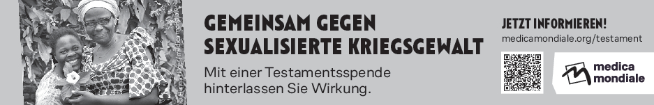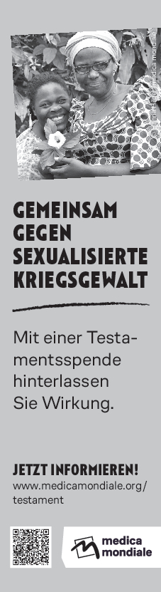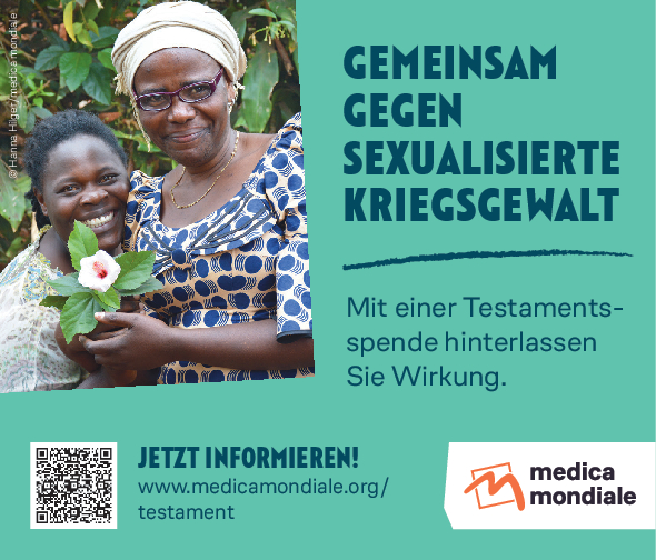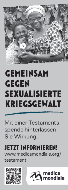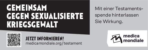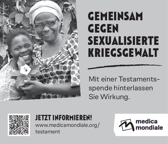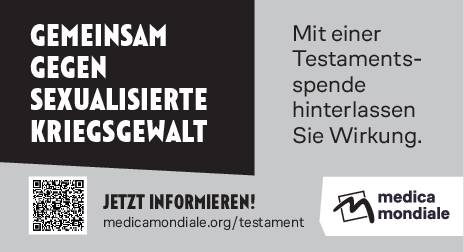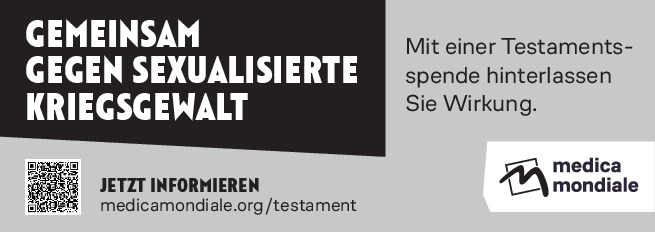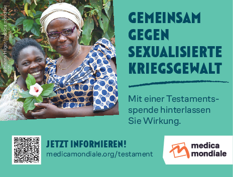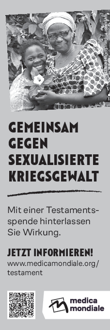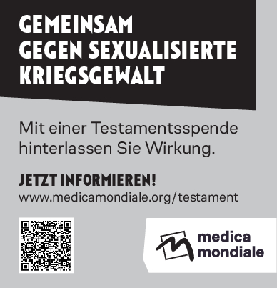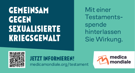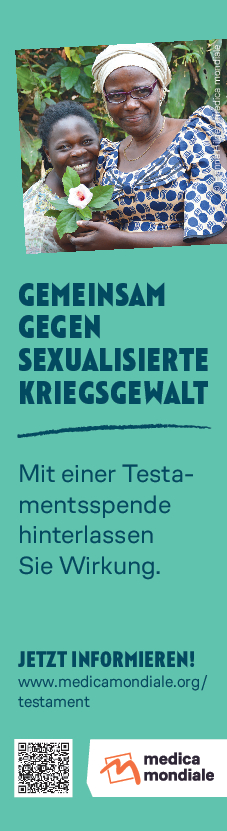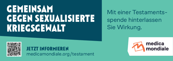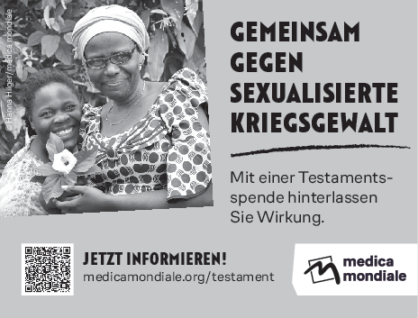 Mit Ihrer Unterstützung leisten Sie einen wertvollen Beitrag: Durch die Veröffentlichung unserer Anzeige zur Testamentsspende helfen Sie dabei, Menschen zu erreichen, die über ihren Nachlass nachdenken – und dabei auch an Frauen und Mädchen weltweit denken möchten.