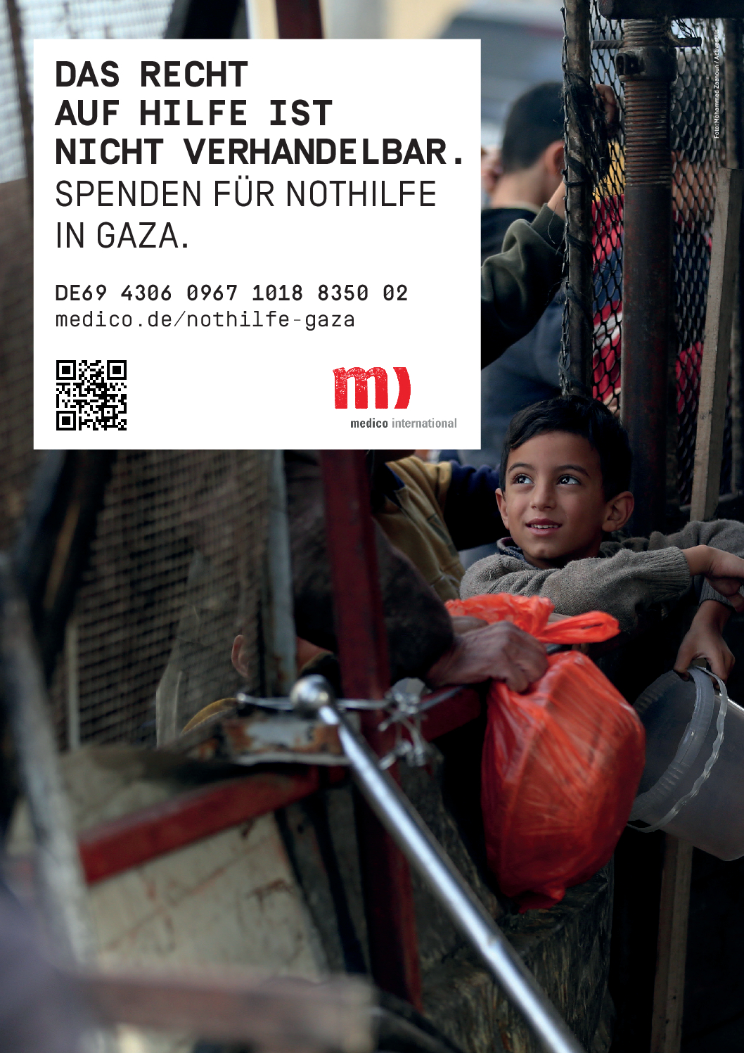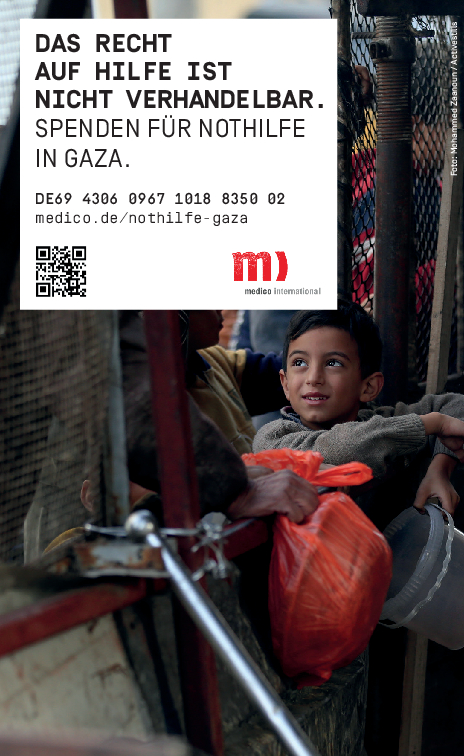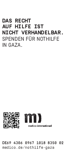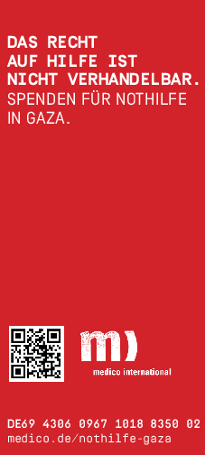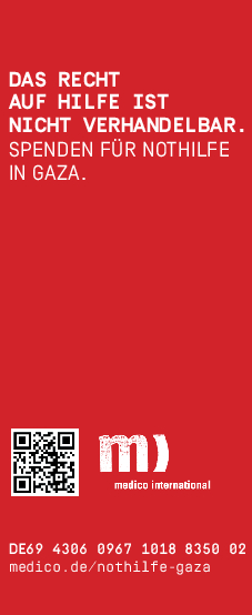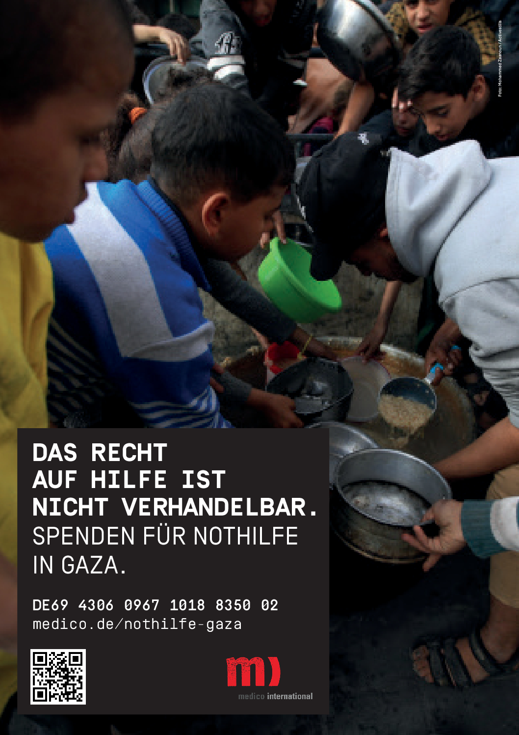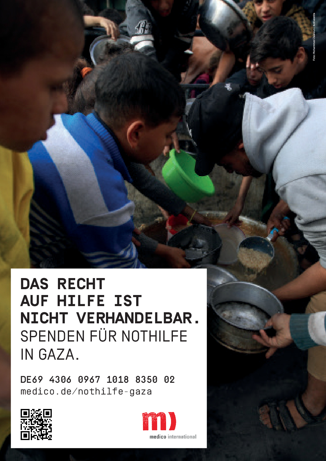 Über 30.000 Tote, Millionen Vertriebene, der Gazastreifen in weiten Teilen unbewohnbar. Partner:innen der Hilfs- und Menschenrechtsorganisation medico international leisten unter unmöglichen Bedingungen Nothilfe. Sie kümmern sich um die medizinische Versorgung der Vertriebenen und betreiben Suppenküchen für die Essensausgabe. Im zunehmend aussichtslos erscheinenden Nahostkonflikt besteht medico international seit Jahrzehnten an der Seite grenzüberschreitender palästinensischer und israelischer Initiativen darauf, dass das Recht auf menschenwürdige Lebensverhältnisse und auf Gesundheit für alle Menschen zwischen Mittelmeer und Jordan gilt. Medico ist bis heute an der Seite der Partner:innen in Israel und Palästina und unterstützt so gut, wie das gerade möglich ist.