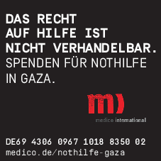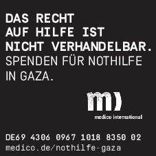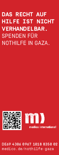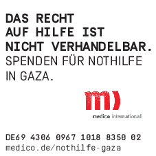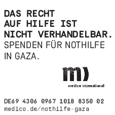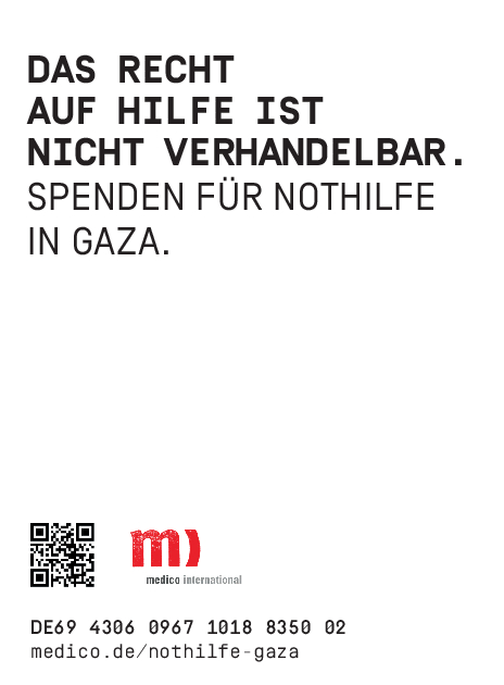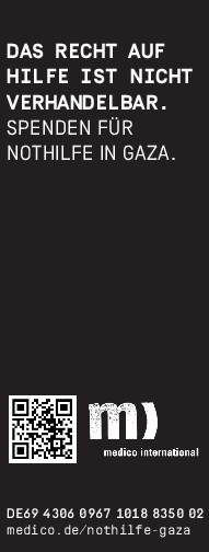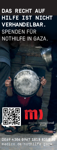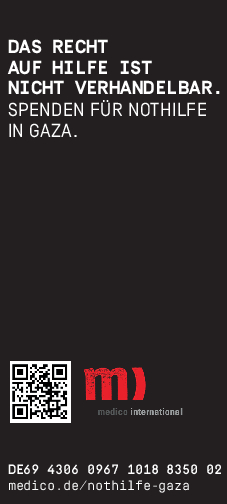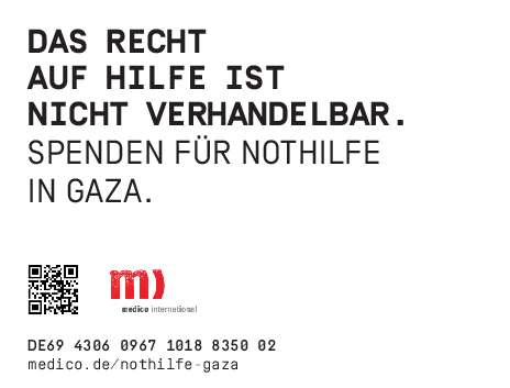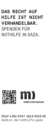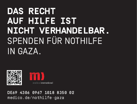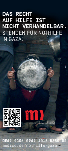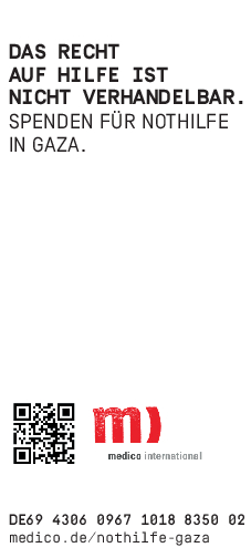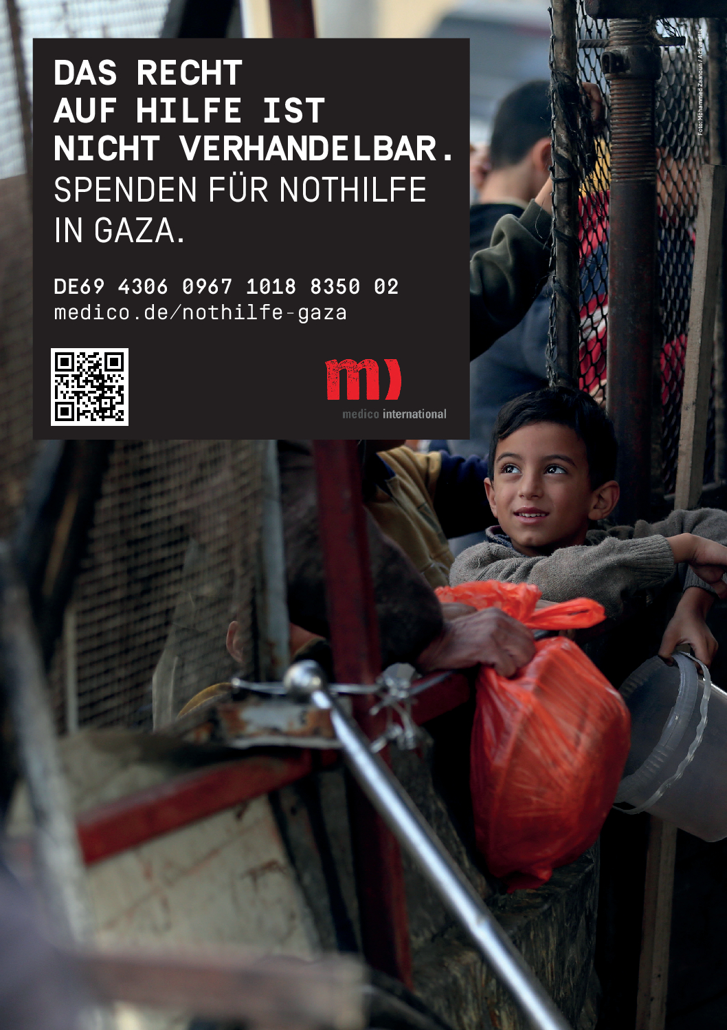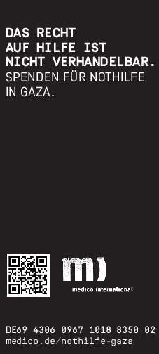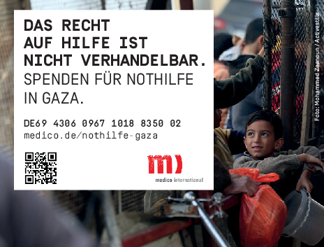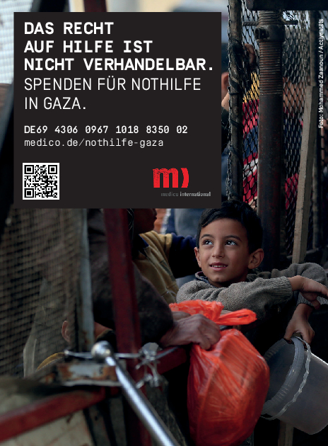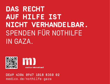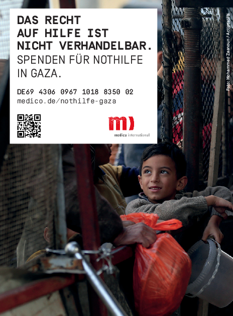 Über 30.000 Tote, Millionen Vertriebene, der Gazastreifen in weiten Teilen unbewohnbar. Partner:innen der Hilfs- und Menschenrechtsorganisation medico international leisten unter unmöglichen Bedingungen Nothilfe. Sie kümmern sich um die medizinische Versorgung der Vertriebenen und betreiben Suppenküchen für die Essensausgabe. Im zunehmend aussichtslos erscheinenden Nahostkonflikt besteht medico international seit Jahrzehnten an der Seite grenzüberschreitender palästinensischer und israelischer Initiativen darauf, dass das Recht auf menschenwürdige Lebensverhältnisse und auf Gesundheit für alle Menschen zwischen Mittelmeer und Jordan gilt. Medico ist bis heute an der Seite der Partner:innen in Israel und Palästina und unterstützt so gut, wie das gerade möglich ist.