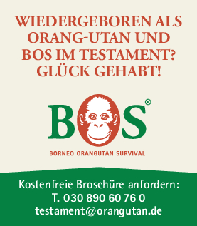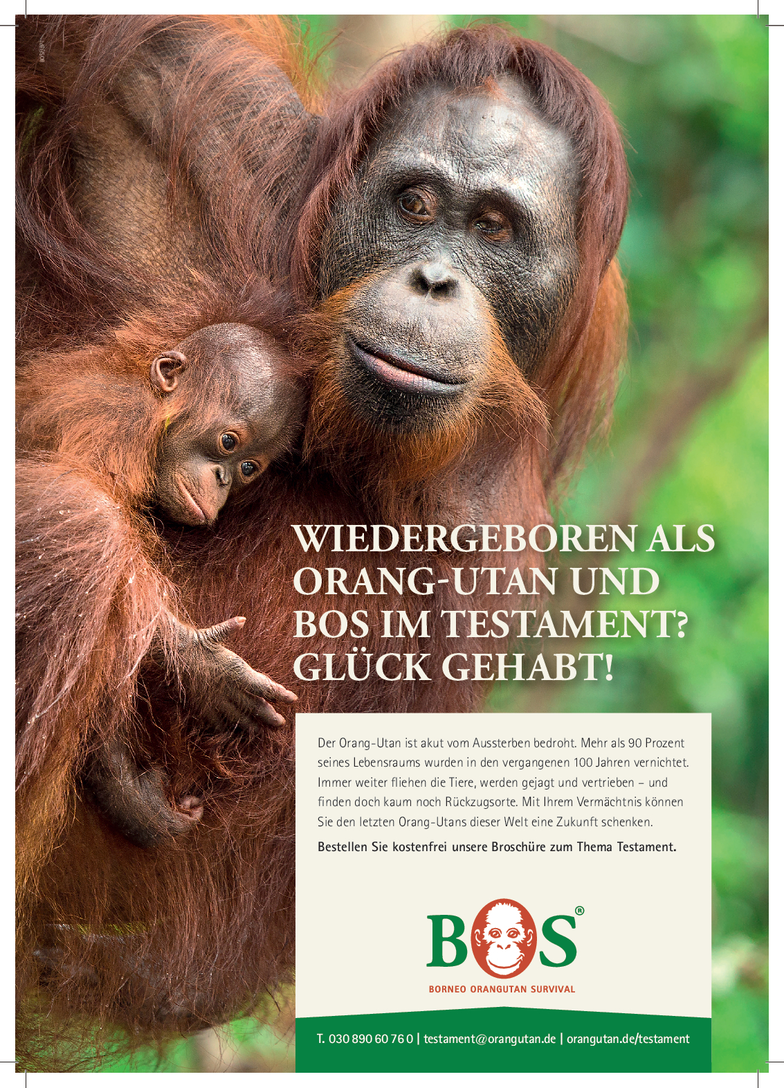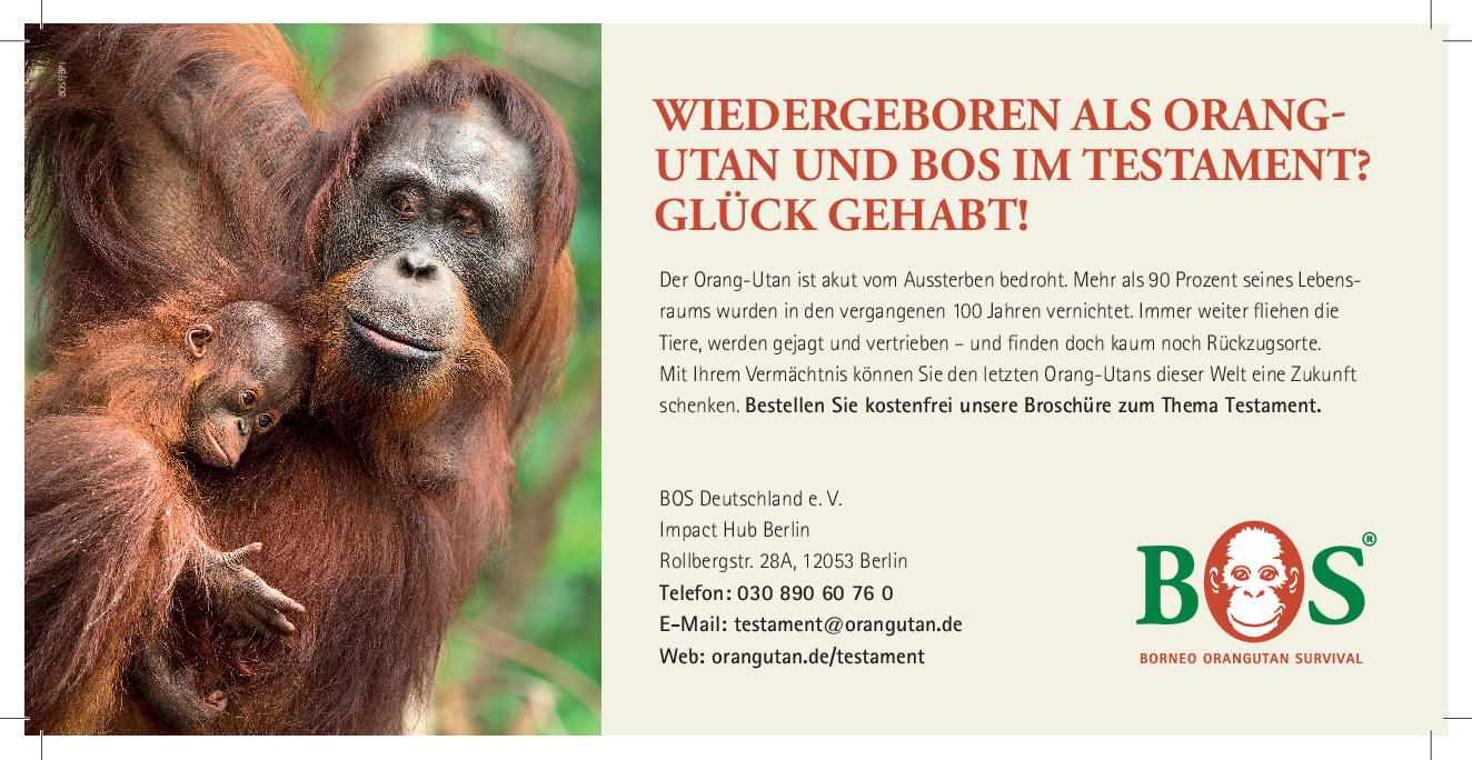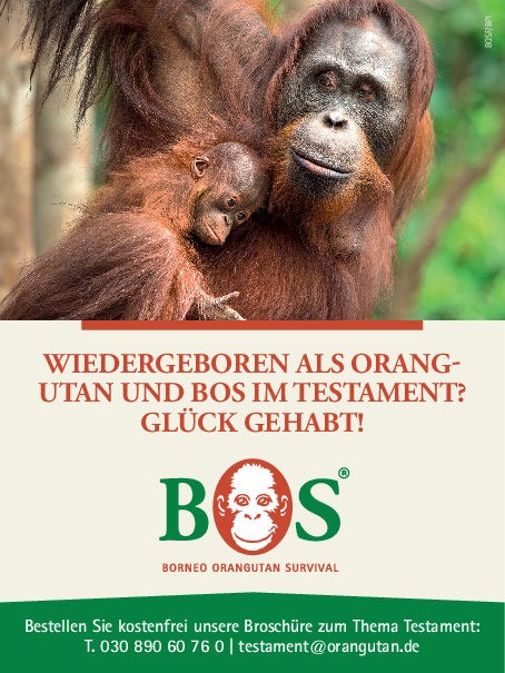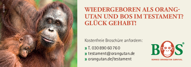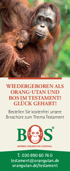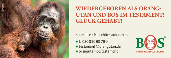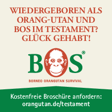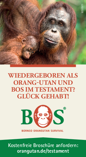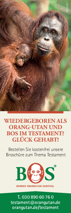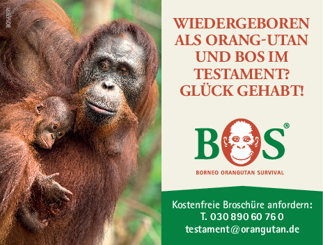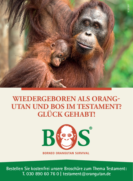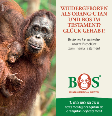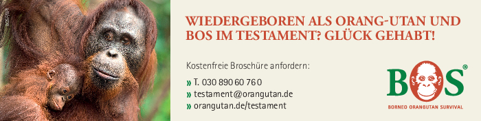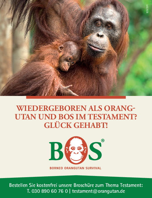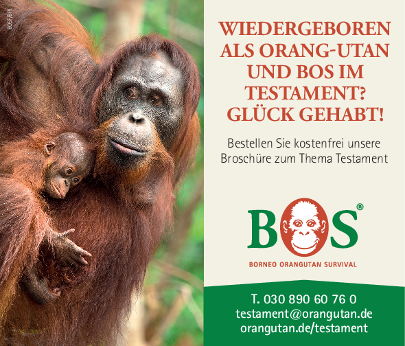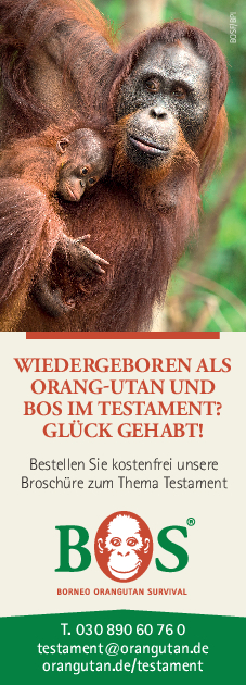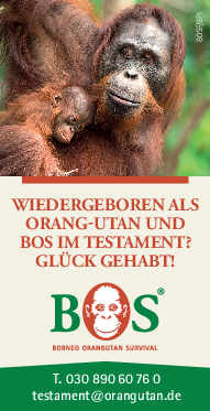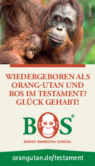 Der Orang-Utan ist akut vom Aussterben bedroht. Mehr als 90 Prozent seines Lebensraums wurden in den vergangenen 100 Jahren vernichtet. Immer weiter fliehen die Tiere, werden gejagt und vertrieben. Sie können uns dabei helfen, das zu stoppen. Die Unterstützung Ihres Verlages ermöglicht es uns, auf Borneo in zwei Rettungszentren mehr als 400 Orang-Utans zu versorgen, zerstörte Regenwaldflächen aufzuforsten und weitere Schutzgebiete zu errichten.