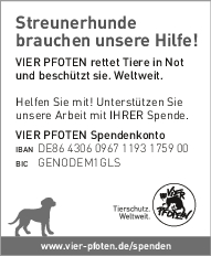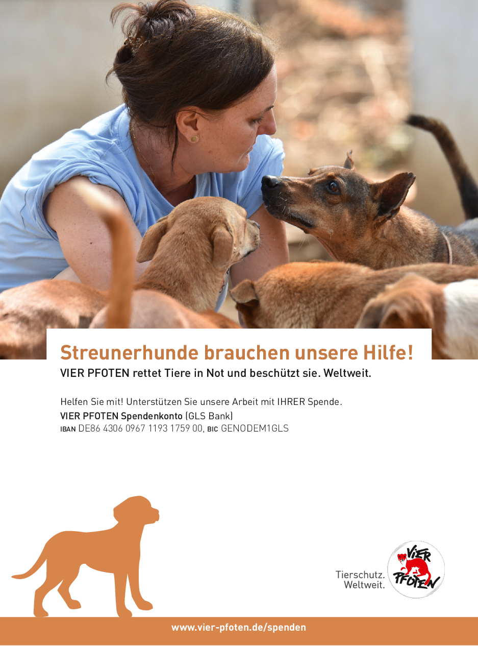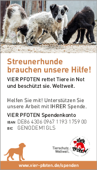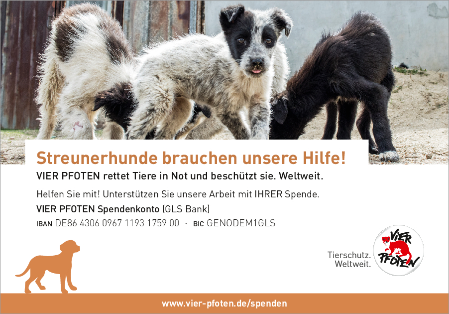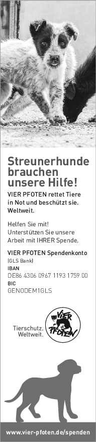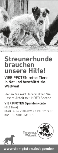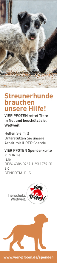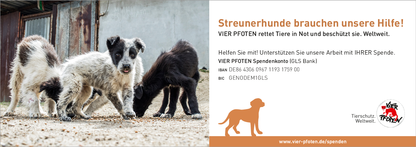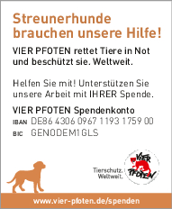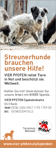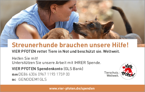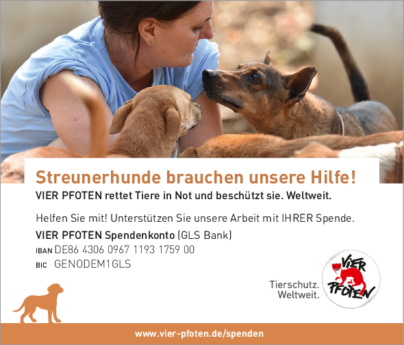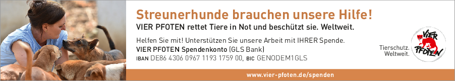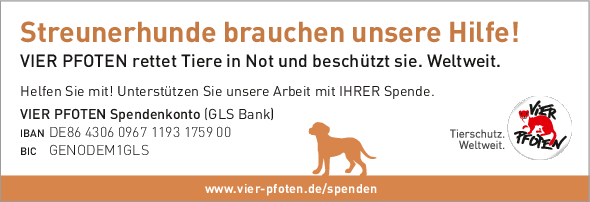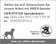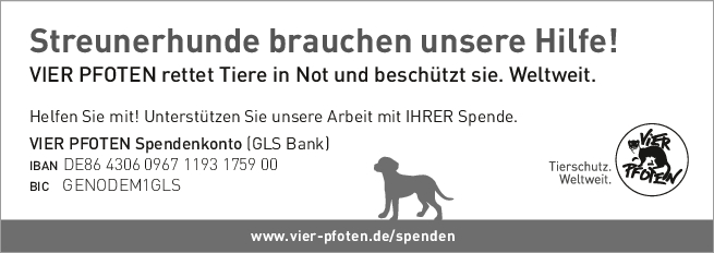 Als gemeinnützige und unabhängige Tierschutzorganisation finanziert sich VIER PFOTEN ausschließlich aus Spendengeldern – jeder Beitrag zählt! VIER PFOTEN dankt Ihnen dafür, dass Sie uns unterstützen wollen. Ihre Spende ist für uns Anerkennung unserer Arbeit, Vertrauensbeweis in unsere Fähigkeiten und zugleich Auftrag an uns, in unseren Anstrengungen, Tieren in Not zu helfen, nicht nachzulassen. Der verantwortungsvolle und nachhaltige Umgang mit den zur Verfügung gestellten Mitteln ist für uns selbstverständlich. VIER PFOTEN ist Mitglied im Deutschen Spendenrat und verpflichtet sich damit zu Transparenz, Sicherheit und Rechenschaft gegenüber Förderern und der Öffentlichkeit.