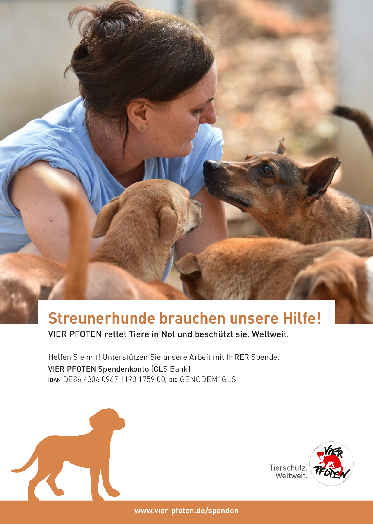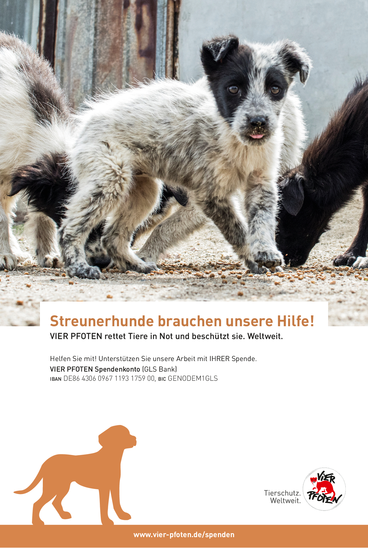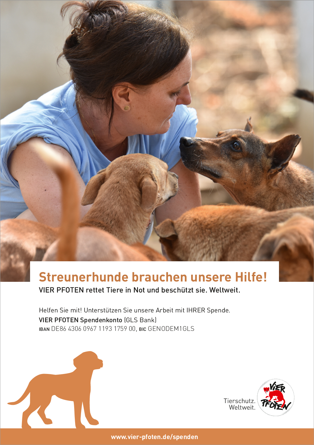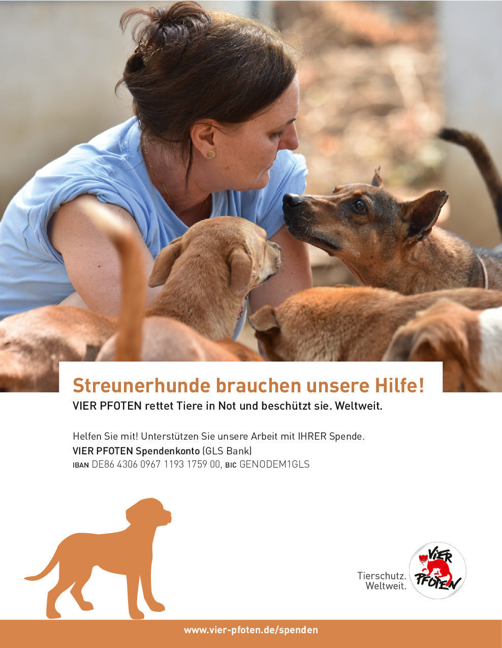 Als gemeinnützige und unabhängige Tierschutzorganisation finanziert sich VIER PFOTEN ausschließlich aus Spendengeldern – jeder Beitrag zählt! VIER PFOTEN dankt Ihnen dafür, dass Sie uns unterstützen wollen. Ihre Spende ist für uns Anerkennung unserer Arbeit, Vertrauensbeweis in unsere Fähigkeiten und zugleich Auftrag an uns, in unseren Anstrengungen, Tieren in Not zu helfen, nicht nachzulassen. Der verantwortungsvolle und nachhaltige Umgang mit den zur Verfügung gestellten Mitteln ist für uns selbstverständlich. VIER PFOTEN ist Mitglied im Deutschen Spendenrat und verpflichtet sich damit zu Transparenz, Sicherheit und Rechenschaft gegenüber Förderern und der Öffentlichkeit.